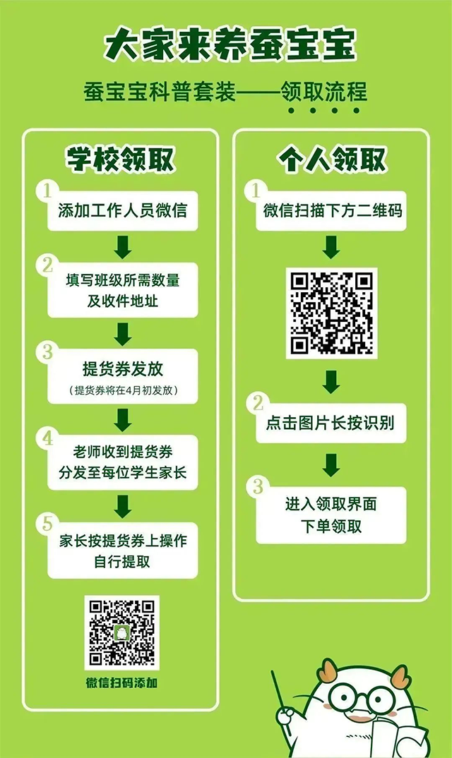 識(shí)別上圖左側(cè)二維碼,添加工作人員微信,填寫所需要的蠶寶寶科普套裝數(shù)量及收件地址,中國絲綢博物館蠶桑基地工作人員將根據(jù)提報(bào)內(nèi)容,發(fā)放相應(yīng)數(shù)量的提貨券,后由學(xué)校老師或家委會(huì)負(fù)責(zé)人將提貨券發(fā)放至每位家長(zhǎng)手中。學(xué)生家長(zhǎng)按提貨券上操作自行領(lǐng)取蠶寶寶科普套裝,套裝免費(fèi),郵費(fèi)自理,全國統(tǒng)一收取郵費(fèi)8元。郵寄過程中如蠶寶寶全部死亡,免費(fèi)補(bǔ)寄一份。飼養(yǎng)過程中學(xué)生家長(zhǎng)可根據(jù)需求向工作人員申請(qǐng)領(lǐng)取桑葉,每次可領(lǐng)取300克新鮮桑葉,桑葉免費(fèi),郵費(fèi)自理,全國統(tǒng)一收取郵費(fèi)8元。