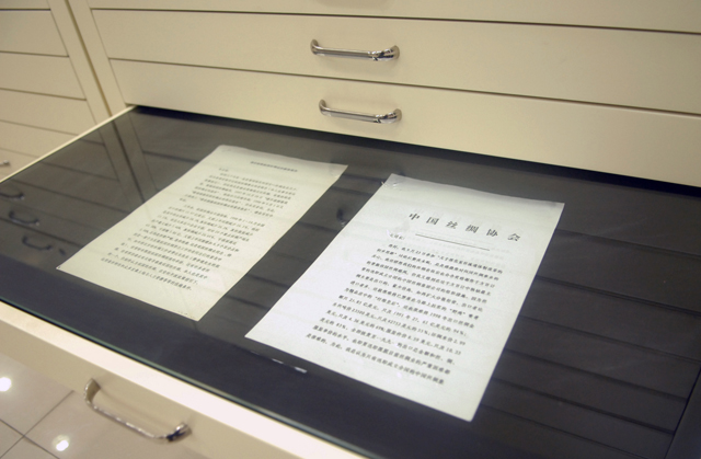 王莊穆先生是備受中國(guó)絲綢界敬仰的老前輩,曾榮獲“全國(guó)繭絲綢行業(yè)終身成就獎(jiǎng)”,在絲綢崗位上從業(yè)55年,親歷了新中國(guó)絲綢業(yè)的風(fēng)風(fēng)雨雨,雖然已是92歲高齡的耋耄老人,但絲毫不改奉獻(xiàn)絲綢的人生信念。2012年,王莊穆向我館捐贈(zèng)1724冊(cè)各類絲綢書籍和個(gè)人證件等珍貴檔案。此次展覽展出的是其捐贈(zèng)的部分檔案資料,包括絲綢著作、手稿、信件及榮譽(yù)證書等,我們可以從中一窺新中國(guó)絲綢發(fā)展的歷史脈絡(luò),并體會(huì)王老對(duì)絲綢的深厚感情和工作激情。
