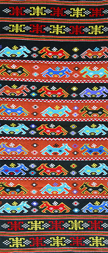 此次展示的這100件織錦中,其中半數(shù)以上已不再流傳,主要種類是西蘭卡普?!拔魈m”在土家語里是鋪蓋(被面)的意思,“卡普”是花的意思,這種“花鋪蓋”是土家姑娘必備嫁妝。同時,在土家族以往只有口頭語言而無文字的歲月里,西蘭卡普作為傳承歷史文化、宗教倫理以及生產(chǎn)、生活知識的一種重要載體,被世代相傳。今天讓我們通過西蘭卡普艷麗悅目的色彩和直線造型的意象圖案,共同感悟土家人的精神世界。