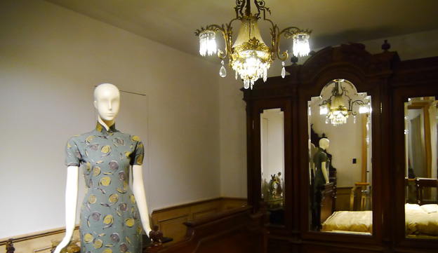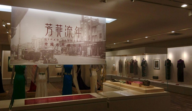 本次展覽由南京博物院與中國絲綢博物館聯(lián)合主辦,共有展品91件/套,分成兩大版塊分別陳列于民國館與精品館。民國館公館區(qū)為場景式展示,有身著旗袍的模特圍著方桌打牌、吃西餐的場景;有身穿旗袍的婦女在客房的場景,與民國時期的紅木老家具配套展示。老式留聲機(jī)里周璇的歌聲緩緩傳出,西餐桌上,精細(xì)的銀餐具,名媛們打牌、用餐、喝下午茶,好像是七八十年前公館里的一個下午,還原的民國場景足以讓觀眾入境。精品館主要講述旗袍的起源、流變、發(fā)展和工藝,有上世紀(jì)三四十年代最經(jīng)典的民國旗袍,也有本世紀(jì)七八十年代來自港臺地區(qū)以及海外名媛們穿過的旗袍,同時,還有當(dāng)代經(jīng)過設(shè)計(jì)師改良后的帶有旗袍元素的禮服。