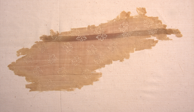 這件蠟染雖然只有四瓣小花這樣一種圖案,但在雕版時采用了一對約為緯向25cm、經(jīng)向11cm的雕版,雕成完成對稱的鏤空版。在施蠟時先將兩塊雕版對稱地夾住織物,再通過鏤空處進行加蠟。然后是解開雕版,進行染色。因此,這種防染技術(shù)是結(jié)合了蠟染和夾纈兩種工藝進行的,這種方法應(yīng)該產(chǎn)生在盛唐之后。