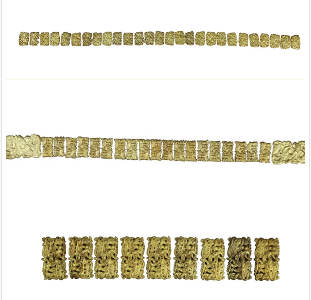 1組21件:長9、寬5.3~5.5厘米,重6.22~6.64克。長4.8~5、寬2.6~2.8厘米,重1.58~2.67克。金腰飾總重48.13克。
