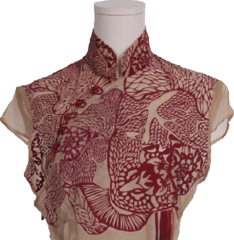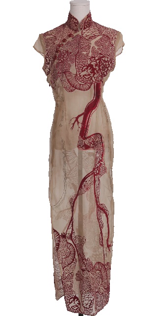 This Qipao was made when I accompanied my mother to overcome her pain. This is also a gift to celebrate her recovery from the disease. When I looked after her in the hospital, I deeply felt that the company of one’s family, a powerful body and positive attitudes are essential to every patient and even everyone. I used red thread to symbolize the care and connection between families. Locked stitch and Panjin stitch (traditional Chinese embroidery technique) are adopted around the pattern of vessels. Paper engraving, one kind of traditional art, has been applied to illustrate the pattern of flowers-like heart. I used silk, whose color is close to skin to embroider a medal for those who overcame their pain and help the patient confront the diseases.