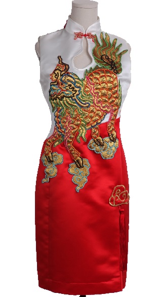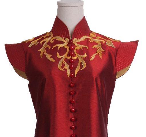 This is a modified Qipao dress with the design of Kylin and Jade book embroidery. Red and blue are the basic colors of the dress. “Jade book and Kylin” is representing the happiness and fortune. In the local traditions, bride’s bedside will need to stick an amulet of Kylin, praying for kids.