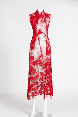 本作品是在人、衣、空間之中,以人的形體為起源,擴充形體之外的形體,在紗線浮空圍繞成型的空間中演繹著由女體(女性身體自主權(quán))、血脈(延續(xù)生命的天職)、成長(花樣般的年紀出嫁)三個元素所構(gòu)筑而成的嫁衣。深紅色的車線、大紅色的緞帶和蕾絲,增生成一塊面料,并且以環(huán)繞的方式構(gòu)筑成一件旗袍領洋裝。兩種紅色為主色,傳遞了新舊血脈延續(xù)的訊息、并呈現(xiàn)出嫁衣的吉祥喜氣。在嫁衣的正背面處,各置入了一個由緞帶所構(gòu)筑出的女體線條。散落的蕾絲花片則呈現(xiàn)出花樣般的待嫁女兒與母親之間的傳承,象征一個少女即將進入少婦的成長過程。