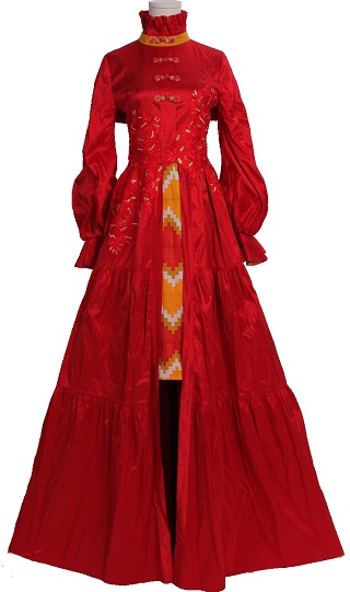 內(nèi)裙是加納特有紋樣的短窄裙,披上紅色罩裙,背后優(yōu)雅的小披肩,整體耀眼奪目,是慶祝宴上最顯眼的主角。施華洛世奇水晶組成的紋樣星星點點點綴腰間,是慶祝的焰火,綻放的玫瑰。設計師重點保留了旗袍元素中的立領要點以及盤扣特色,完美結(jié)合了中、西、加納的文化特色。