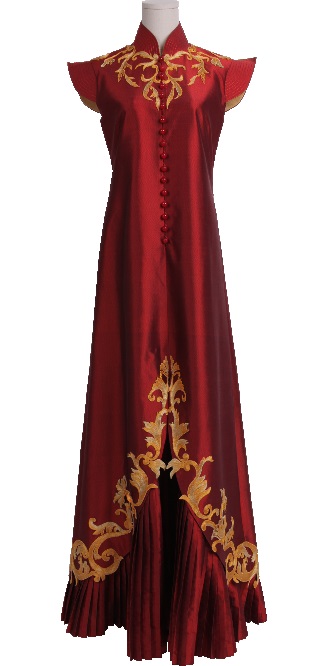 這件衣服的設計靈感來自于一位在泰國出生和長大的(泰籍)華裔設計師,因此這件作品完美地融合了泰中兩種文化。中國的傳統(tǒng)旗袍的設計形式結(jié)合泰國南奔絲綢面料,向我們展現(xiàn)了兩國美麗文化的獨特魅力。(注:南奔是泰國北部一個地名,以盛產(chǎn)傳統(tǒng)泰絲綢為名)備。