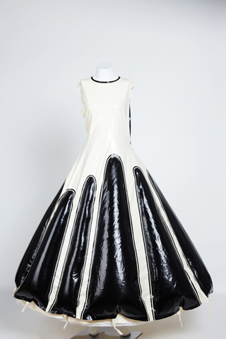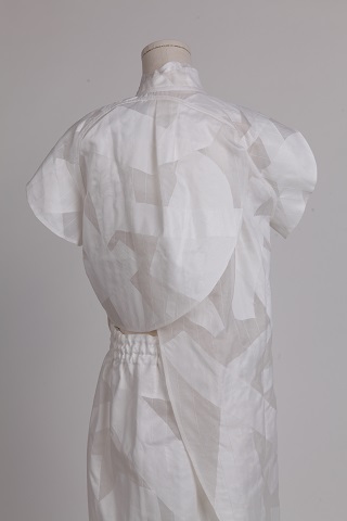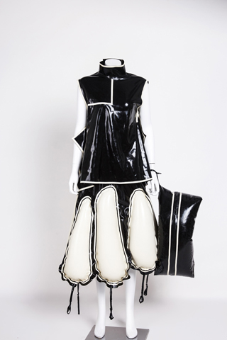 取自漢字“冇”,空無之意,作品嘗試探究無形介質(zhì)——“空氣”對于時裝造型的改變。整個系列以平面裁剪的形式展現(xiàn),通過充氣的形式將平面服裝變得立體生動,以此來詮釋中國傳統(tǒng)文化里的“有”跟“無”之間相互關(guān)系。