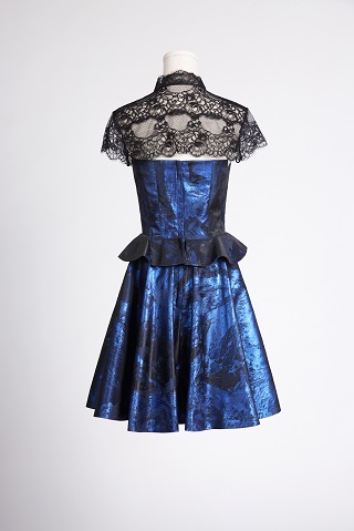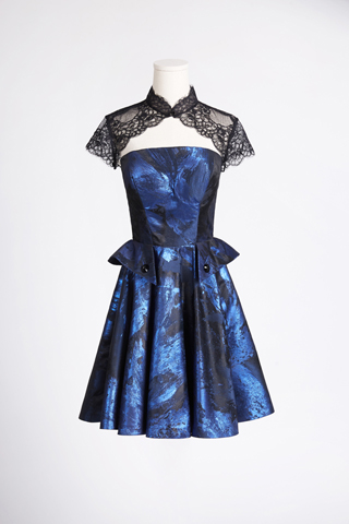 經(jīng)典的西式小禮裙配上蕾絲的中式旗袍立領成就了這件獨特的裙裝。設計師將中西方元素各取部分融入設計中。裙子使用了深藍代表夜空的色彩,其中閃耀著星光。蕾絲外套則是飄浮于空中暗色的云。