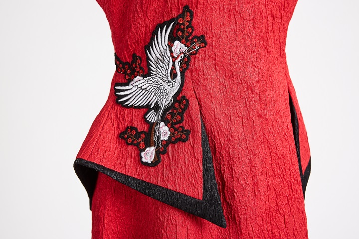 Red is a traditional celebration color in Chinese culture, and crane is an animal stands for happiness in China. I want to put those Chinese celebration elements in a Western formal dress, so all people will know this is a dress for celebration. I want this dress to cross the barrier of language or region, passing a happy message for everyone.