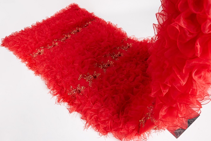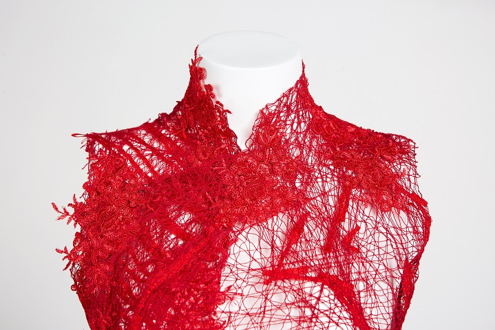 Using the shape of human as the origin, and expand a form other than it. The floating thread has created a dress that holds three elements of woman’s body, blood relationship and maturity. The different kinds of red pass messages of the happiness, blood relationship with mother and daughter, and the growing process of a new young bride has just become mature.