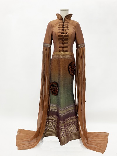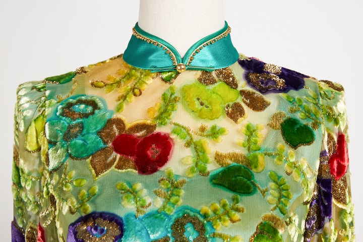 沉穩(wěn)的翠色與明亮的淺綠相結(jié)合,展現(xiàn)了一片柔和與華貴的生機。外罩的斑斕五彩宛若花園給人以視覺的美感。設計師曾穿著它出席慶典等重要場合,后藏于中國絲綢博物館。