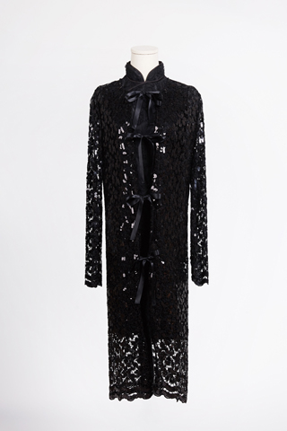 作品為不對稱設計,只有一片領子。一側(cè)衣身保持旗袍廓形,袖子為蕾絲質(zhì)地旗袍式短袖;另一側(cè)衣身為時裝禮服廓形,側(cè)縫中拖曳出十二組螺旋形裙片,似展開的鳳尾;袖子為雪紡的禮服式長袖,肩部打褶,“盛開”著黑色的薄紗花朵,袖口的金屬中國結(jié)成為通體深深淺淺“墨色”中的一抹銀白。