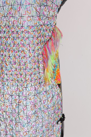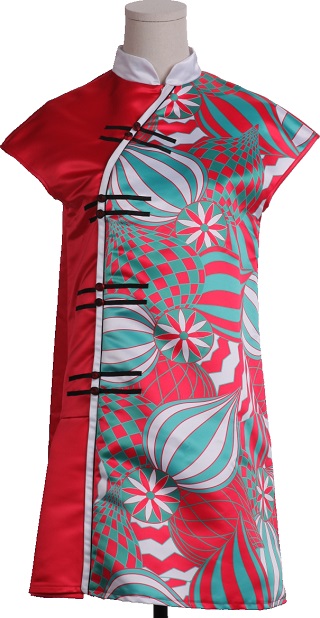 The original inspiration of my Qipao comes from the painting “Appearance of Crosses” by Yi Ding, a contemporary artist of abstraction in China. I extracted the color from the painting and added some fluorescent colors. I combined two layers of fabric: PVC and adhesive cutting fabric, adopting colored thread embroidery technique to make my new fabric. Meanwhile, I created my own embroidery and technique to inject a contemporary style into traditional Qipao. One end of the embroidery thread was stitched to the fabric and another end was kept loose and decomposed into traditional tassels. The shape of embroidery is related to the idea of symmetry which Chinese people traditionally pursued. The colors are well-proportioned and cascaded, looking like modern abstracted version of peony, the national flower of China and deliver the meaning of auspiciousness.