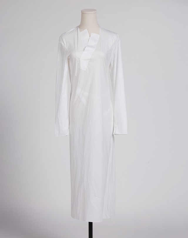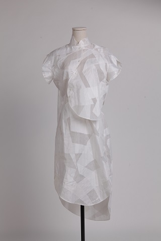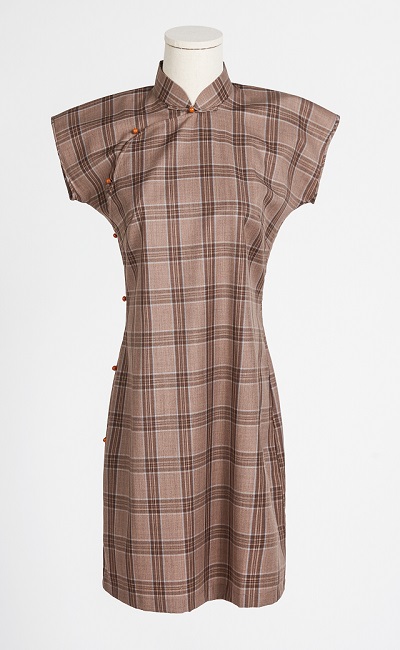 This is a modern work of creativity. This dress is using the shape of coat and the collar of Qipao to explore the potential elements fashion can have in a dress. The dress is smooth and clean in look, as well as an elegance of feeling inside the dress.