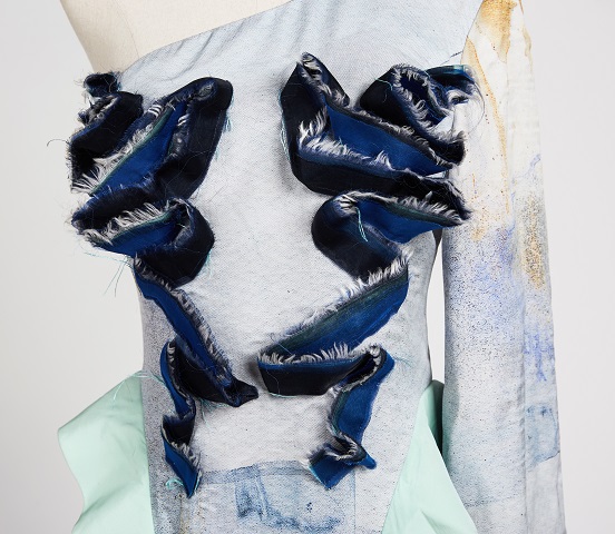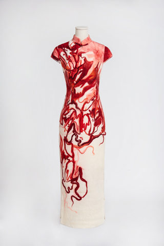 這是根據(jù)陪媽媽一起戰(zhàn)勝病魔的經(jīng)歷創(chuàng)作的,也是為了慶祝母親順利度過難關(guān)。設計師在住院看護的階段里深切地體會到家人的陪伴,身體的堅強,以及積極的心態(tài)對每一個病人乃至每一個人的重要性。紅線表示親人之間的關(guān)心連結(jié),鎖繡和埋金繡法繡在血管周圍,再以紙雕這種傳統(tǒng)工藝,表現(xiàn)擁有美麗花朵紋樣的心臟圖案,印花加上真實的美麗的鮮花,并用貼近膚色的真絲綃鼓勵病人們正視傷痕,以表示這是戰(zhàn)勝病魔的勛章。