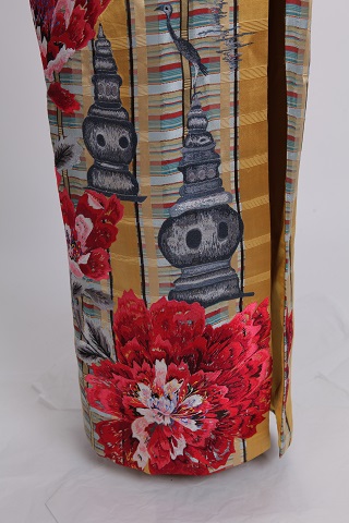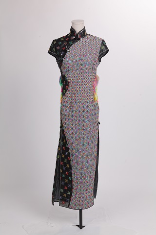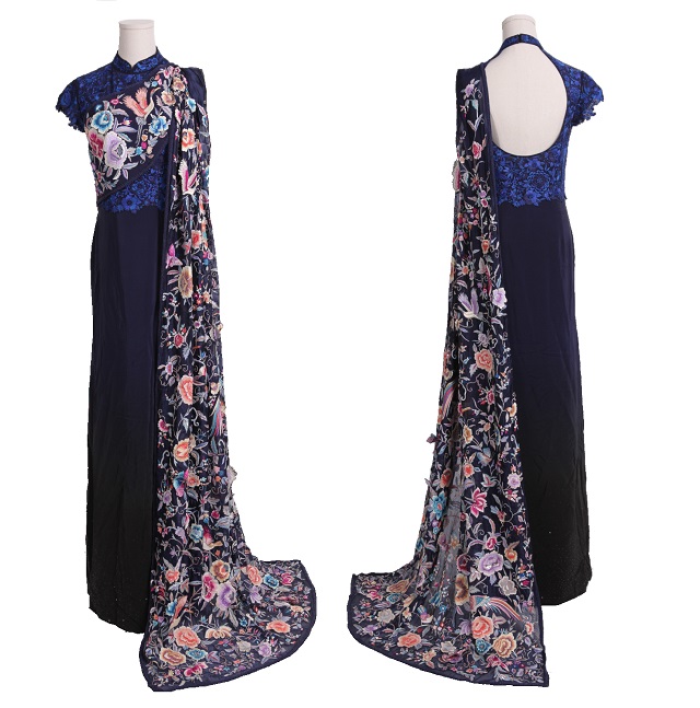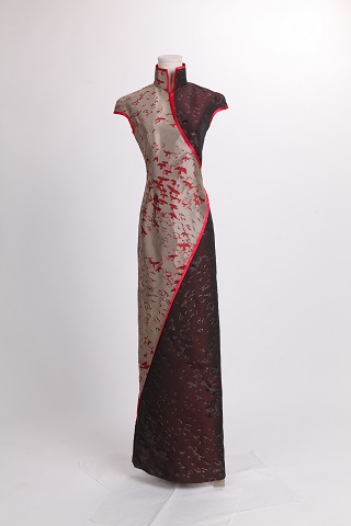 This is a grown in the Qipao’s structure. It used different materials in the black colors to show the different “Ink” in a ink painting. This dress is asymmetrical, there is a one-side collar. One side of the dress remains the Qipao structure is the short sleeve like a Qipao, the other side changes to the fashion gown’s structurewith a wide spread dress and a long sleeve.