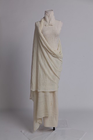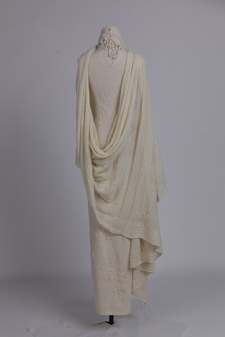 白衣的設計靈感來自于設計師從中國、中國人民和中國古代歷史中獲得的信息。中國制作服飾總是采用最漂亮的面料,比如絲綢,因此設計了一件繡有天藍色寶石和銀色金屬的白色絲綢連衣裙。設計師首先在阿富汗當?shù)刭徺I了絲綢的面料,之后獲得其他部分的材料完成心中的設計。
