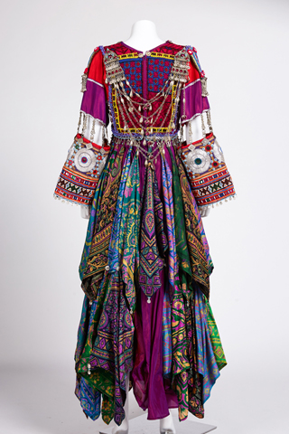 設計師向設計一件當代阿富汗的服裝。緊身胸衣和袖子的下半部都有阿富汗傳統(tǒng)婚禮上仍然使用的傳統(tǒng)刺繡工藝。希望裙子的設計與傳統(tǒng)不同,添加了一些西方的顏色。因此裙子整體用傳統(tǒng)的阿坦舞中使用的方巾制成,色彩艷麗,有如絲綢一般顏色漂亮。其中珠飾是手工制作的。這是一件混合了西方的色彩和傳統(tǒng)阿富汗服裝作品??p合由手工完成,最后以縫紉機連接。