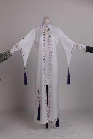 Simple white dress in a Chinese tradition design. It is a fashion dress to present a young lady’s beauty and purity.