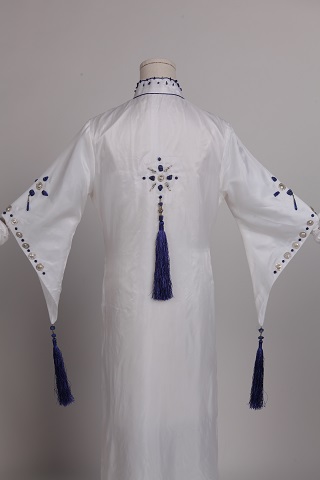 It is a dress with tons of details in side, and also this dress is a result of exploring the possibility of different clothes kinds combining in one. The dress has elements of one-piece dress, Qipao and cloak. It seems like those elements are impossible to combine, but they end up combining perfectly.