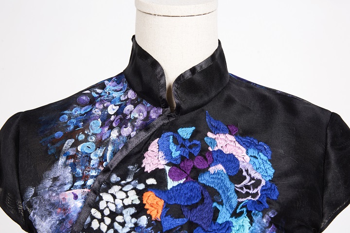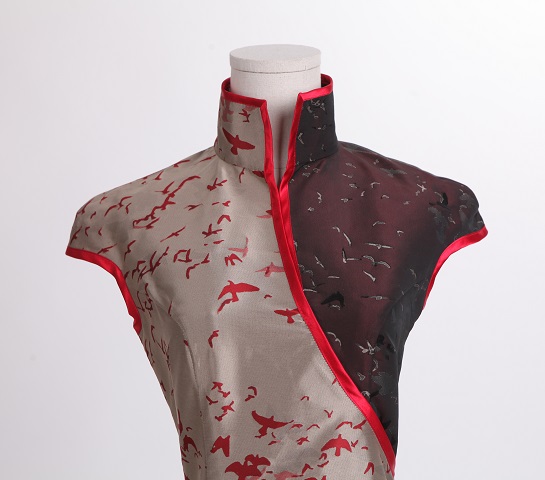 The fabric of my Qipao is two layers of translucent silk, black and white. Fabric bonding and embroidery technique have been applied in my garment.