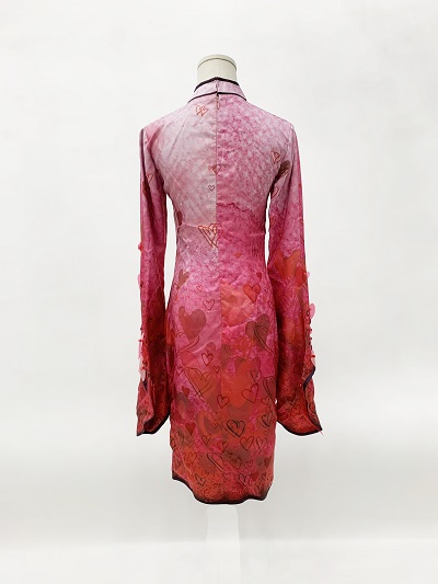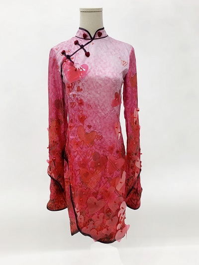 This is meant to be the Qipao of sweetness and tenderness like a flag that calls out love as the most beautiful decoration. The heart is a symbol of unity and gathering, the heat is a universal message. Angelo conceived this work listening to the great love songs of the Chinese Popstars. The theme of feelings characterizes almost all Chinese songs, love as the center of the world, central like the attention that every woman desires. A fabric talisman that makes every woman feels like Aphrodite: the goddess of love.
