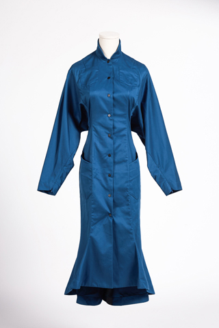 這是一款從現(xiàn)代出發(fā)的創(chuàng)新式作品,其中融入了現(xiàn)代的風衣外形與旗袍的立領特色。干凈利落的設計和古典優(yōu)雅的氣質(zhì)在這件服裝中一覽無余。同時這也是一件對現(xiàn)代服裝的可發(fā)展性元素的探索的成果。