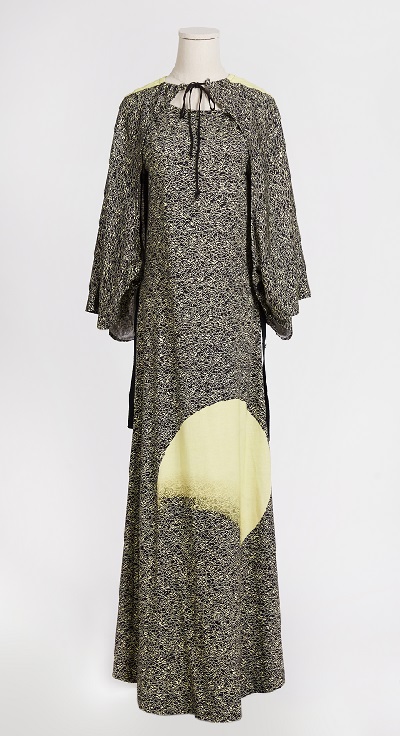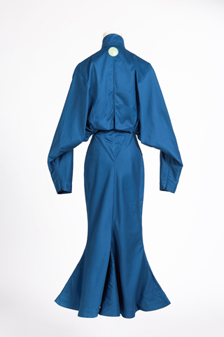這是一件暗藏著許多小細節(jié)于一身的裙子,也是對多功能多部件合為一體件服飾的可能進行探索的成果。這件裙子包含著連衣裙、旗袍元素、小斗篷等多種不同的類型。乍一看似乎是無法融合的各類,但設計師巧妙的將其結(jié)合,成為一件無與倫比的時尚之選。