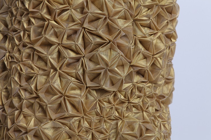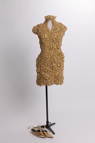 作品體現(xiàn)對于科技概念的持續(xù)關(guān)注,同時圍繞當代和傳統(tǒng)展開思考,視覺上將材料語言和構(gòu)成美學理念深度融合到時裝設計中,利用數(shù)千片切割的材料折疊再設計,將大小不同的單元通過復雜的連結(jié)技術(shù)創(chuàng)造出對比起伏的立體空間形態(tài),賦予作品以通靈剔透的視覺藝術(shù)效果,使服裝通體如陽光下的礦物結(jié)金。