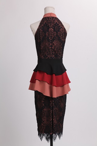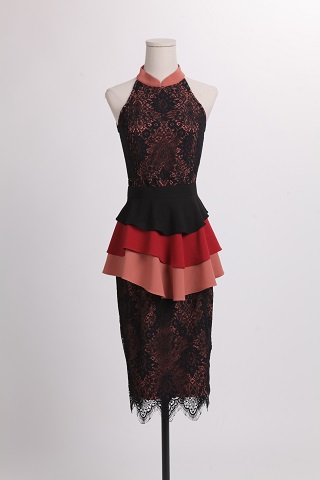 設計師對旗袍時尚作出了與眾不同的詮釋。旗袍不止可以古典,也可以與時裝相結(jié)合。設計師保留了旗袍特有的曲線設計,同時為了強調(diào)臀部曲線,她特意添加了三層漸變小短裙作為點睛之筆。其余則以黑色蕾絲覆蓋淺粉作為主體,盡顯優(yōu)雅。