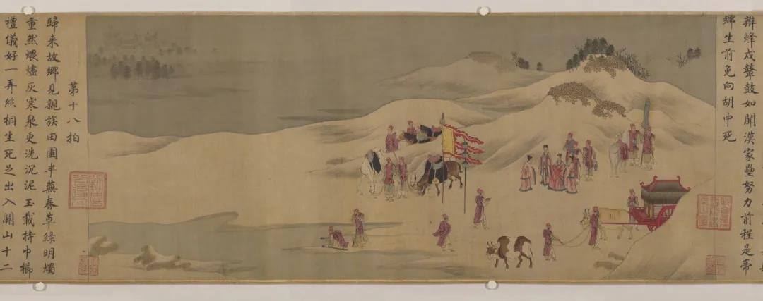 “今日漢宮人,明朝胡地妾?!薄耙簧嫌耜P(guān)道,天涯去不歸?!彼齻兲厥獾拿\(yùn)遭遇曾引起無數(shù)文人和藝術(shù)家的同情感懷,在歷史上留下了無數(shù)的詩篇和繪畫作品。于6月19日-8月23日在國絲展出的“眾望同歸:絲綢之路的前世今生”展覽中就特別展出了來自吉林省博物院的《文姬歸漢圖》和南京博物院的《胡笳十八拍》,為人們展示中國古代繪畫中的這一題材作品。