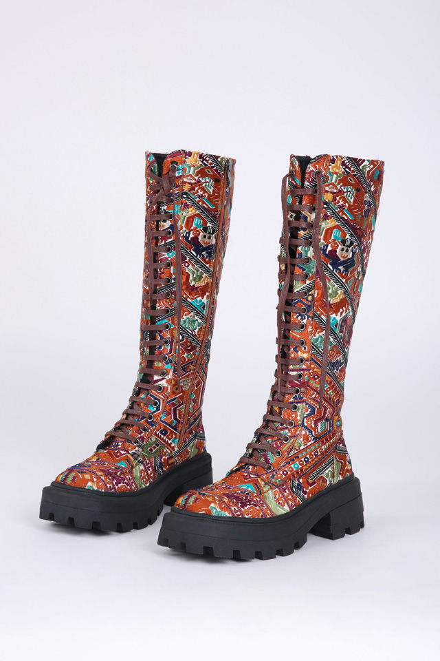 設(shè)計說明:鞋面上的刺繡圖案來自于遙遠的苗疆,每一幅苗繡圖案里往往隱藏著一個悠遠而神秘的故事。鞋面人形紋樣代表祖先護佑、生生不息的信仰,是昌盛吉祥的寓意符號。設(shè)計師通過對原有苗繡形態(tài)進行解構(gòu)和改良,調(diào)整局部配色,將其圖案再運用到時尚款式的靴子上,得到很有視覺沖擊力的效果,傳達了設(shè)計師的“民族既時尚”的美學(xué)觀點。
