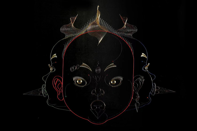 設(shè)計說明:作品以LED霓虹燈線結(jié)合傳統(tǒng)盤金刺繡工藝,營造一個當(dāng)代復(fù)活版哪吒,希冀將來有更多當(dāng)代最新的科技材料成果引入到蘇繡藝術(shù)的探索和實踐中來,以豐富和更新其藝術(shù)語言和針法系統(tǒng)。