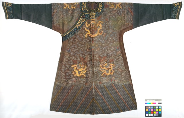 絳色納紗平金龍單袍(清,沈陽故宮博物院藏)保護(hù)修復(fù)方式:保護(hù)修復(fù)方式:針線縫合加固(局部)