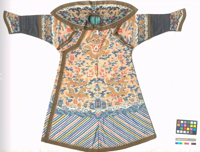 杏黃緙絲金龍雙喜字女朝袍(清,沈陽故宮博物院藏)保護(hù)修復(fù)方式:針線縫合加固(局部)