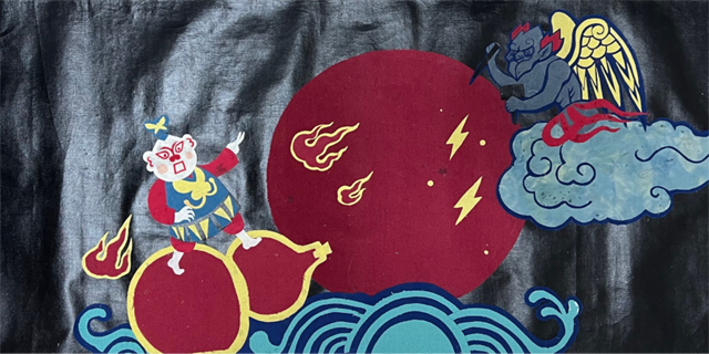作品簡介:本作品的創(chuàng)作從苗族傳說《苗族史詩》中汲取靈感,用布藝裁剪拼貼的方式再現(xiàn)了主人公姜央的故事。姜央,是苗族最早的祖先,與雷公本是兄弟。他們因為意見不合而爭斗,使得巨浪滔天,世界被洪水淹沒,姜央和妹妹躲在葫蘆里,在海上漂了三天三夜,得以生存。從葫蘆里出來后,兄妹各奔南北,最后在竹子的指引下,又相遇并結(jié)婚,生下的孩子變成了現(xiàn)在的人類,他們便是苗族人心中人類的祖先。