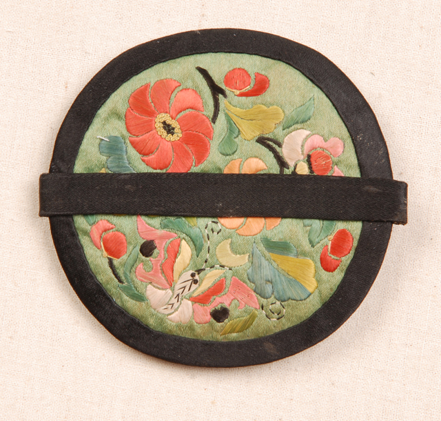 早期的粉撲多為絲綿制成,因此也被稱為“粉中絮”“粉絮”“香綿”,如福建福州黃升墓出土的粉撲,粉撲高3.3cm,直徑6cm,撲背用二經(jīng)絞羅編織成鱗狀放射形花瓣,撲身用絲綿制作。出土?xí)r,粉撲上面還殘留有白色粉末。到了晚清民國時(shí)期,民間所用的粉撲以扁平狀薄圓粉撲為主,這種粉撲背面繡花,邊緣由布條鑲邊,使用時(shí)多釘一條橫向布條,中間伸入手指拿持使用。由于橫釘布條會(huì)破壞粉撲背面圖案的完整性,也有人將其做成雙層,使用時(shí)將手指伸入兩層之間,但較為少見。