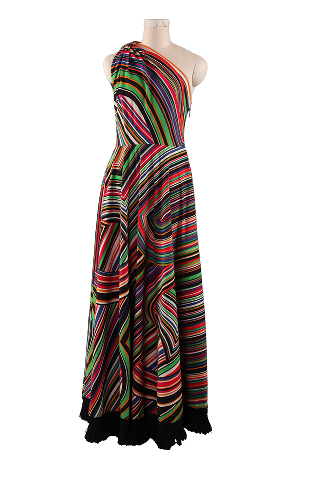 這件棉質(zhì)單肩設(shè)計條紋連衣裙由郎萬時裝屋出品,裙身側(cè)邊裝拉鏈,裙擺用黑色流蘇裝飾。連衣裙紋樣由不同寬度和顏色的條紋及幾何圖形組成。單肩正面和背面是一個銀色金屬環(huán),斜垂在胸衣的另一側(cè),配以兼具裝飾性與功能性大金屬制拉鏈。