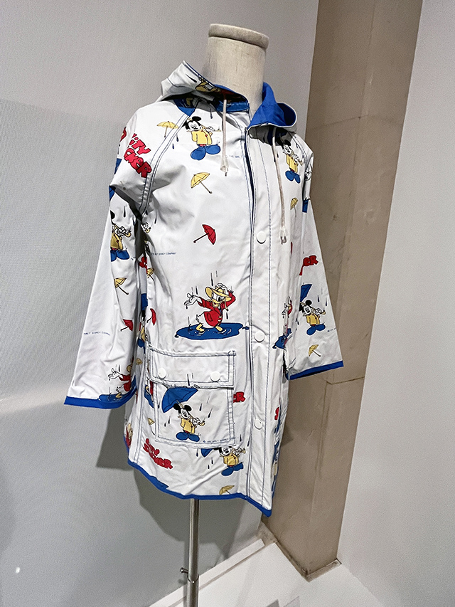 在20世紀60年代波普藝術(shù)運動影響下,條紋、波點等幾何圖案成為流行的服裝 面料圖案。此外,隨著阿波羅登月成功,太空風格也成為20世紀60年代流行潮流的一支,人造革、樹脂材料隨之應(yīng)用于服裝及配飾中。此件雙排扣、翻駁領(lǐng)中長大衣即為上述流行的印證 。