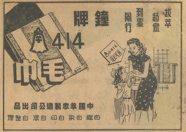 20世紀(jì)上半葉上海另一家著名的毛巾生產(chǎn)廠家是中國萃眾制造股份有限公司,它于1937年由沈維挺、王瑞鱗、李康年等人合資創(chuàng)辦,1940年開發(fā)出鐘牌毛巾,以“萃眾”兩字構(gòu)成鐘形圖案,1947年以“414”作為注冊商標(biāo),獲得專用權(quán)。鐘牌414毛巾的主要規(guī)格是77.5×33.5厘米,適宜洗臉或沐浴之用,為適應(yīng)兒童需要,后又生產(chǎn)尺寸較小的規(guī)格,曾在1948年上海國貨展覽會上獲特等獎。