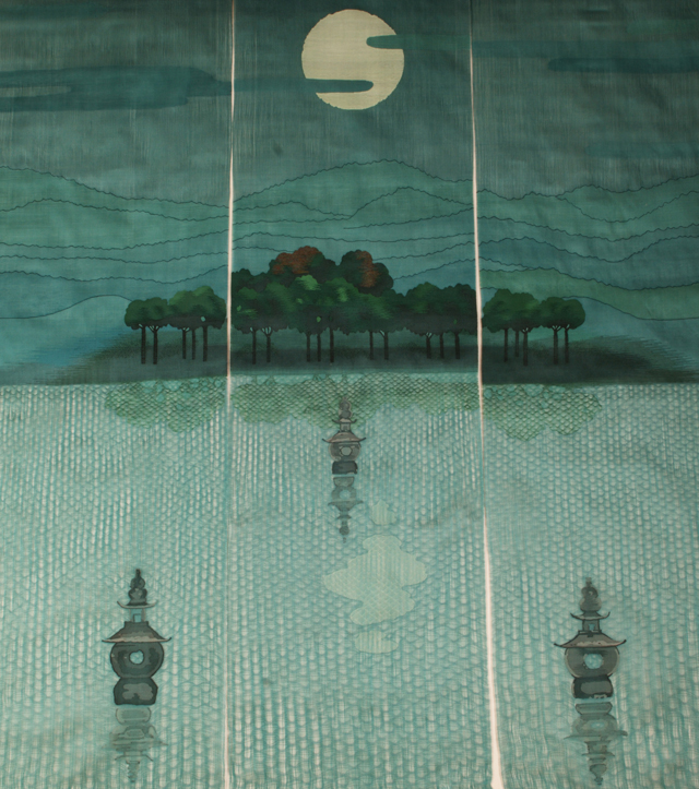 Graphisme qui s’inspire de la grande convergence des motifs de brocart sur les itinéraires de l’ancienne Route de la soie aux époques Wei-Tang. Parcouru par le regard, l’ensemble transporte jusqu’à ces temps de grandes rencontres-fusions culturelles.