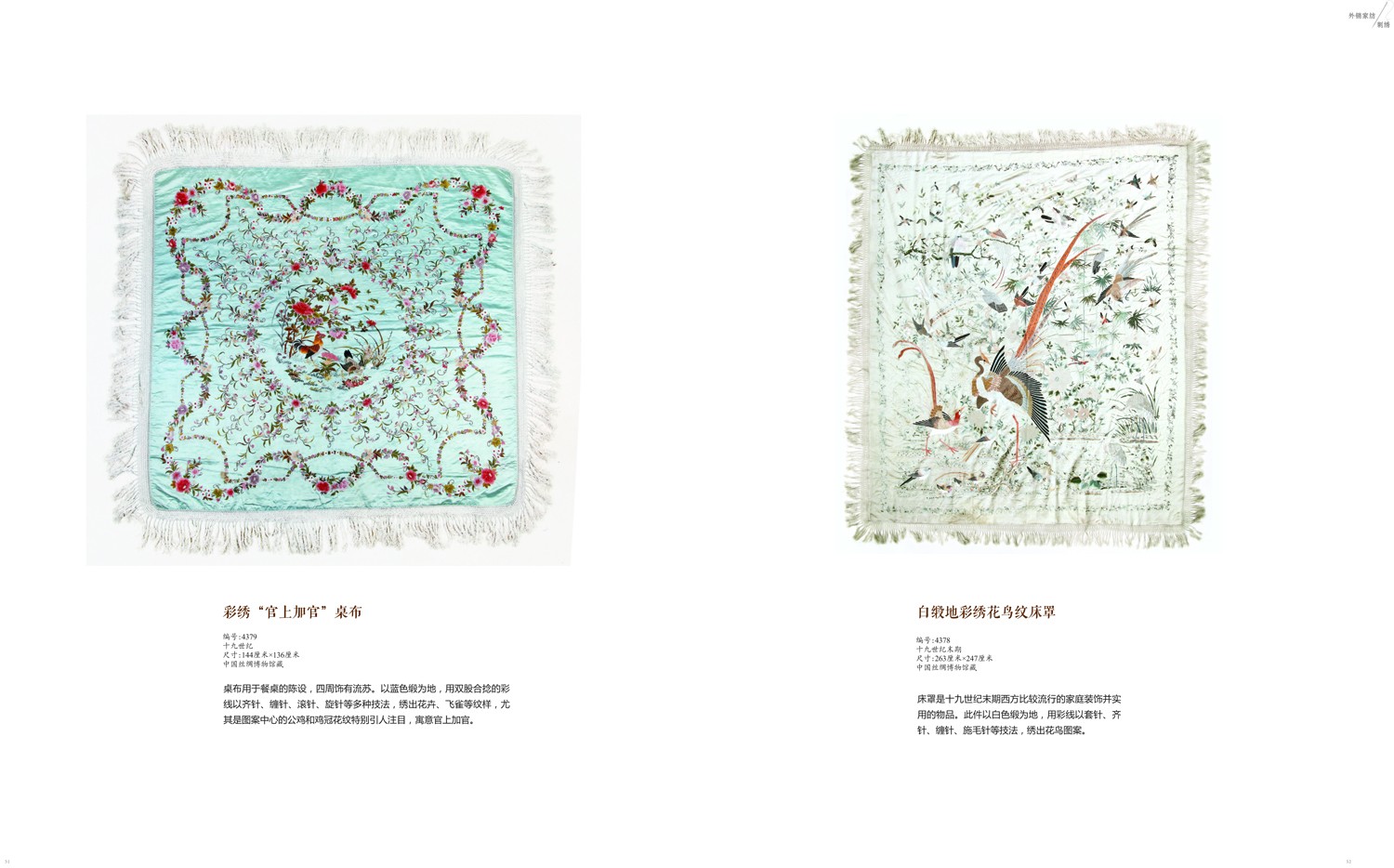 床罩是十九世紀(jì)末期西方比較流行的家庭裝飾并實(shí)用的物品。此件以白色緞為地,用彩線以套針、齊針、纏針、施毛針等技法,繡出花鳥圖案。