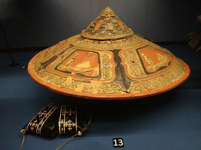 This highly decorative hat was purchased in the 1990s, from an antique gallery in Manila. It comes with a tag that states it is from the Gaddang tribe, made of buri palm, rattan and beads. The Gaddang people live in North Luzon, the Philippines, and their costumes display exquisite beadworks. We were not able to find any information relating the hat to the Gaddang people, whether the item is part of their culture or made solely for trade. We found commercial knit cloth on the hat, an indication of communication with the outside world.