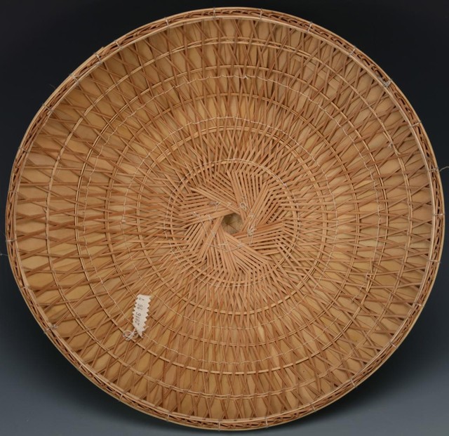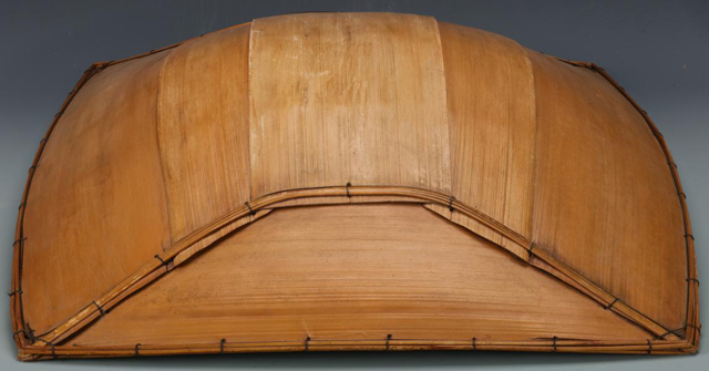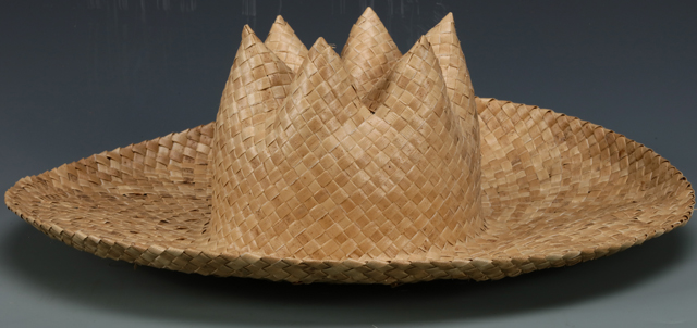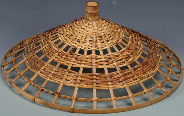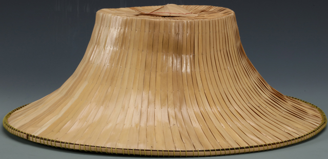 Bamboo can be split into various thickness according to its application. This unusual unfinished hat kept the whole original bamboo as its finial, then the Stake and Strand technique is used to secure its form. Extra leaves and lining would have been added on the underside to complete the hat.