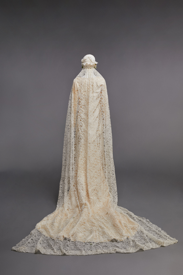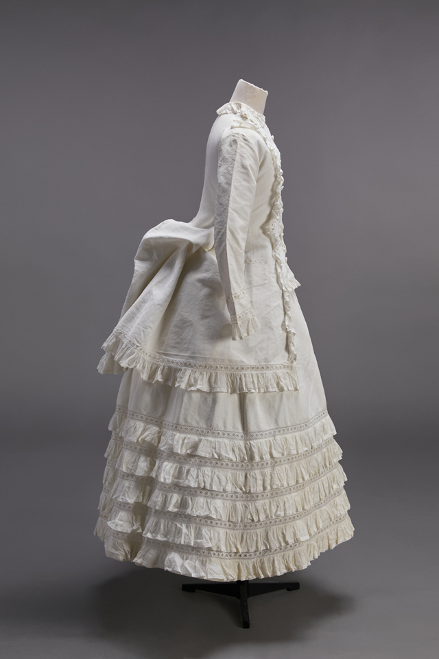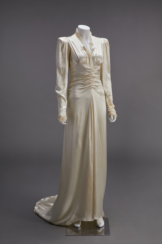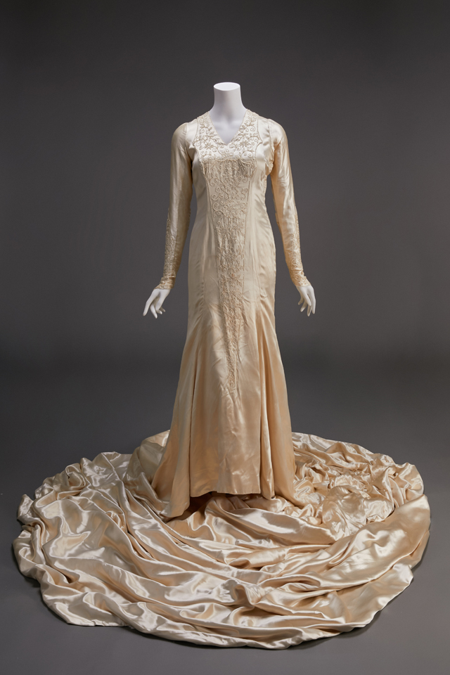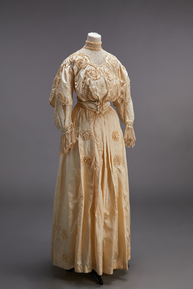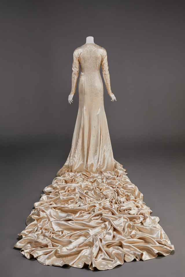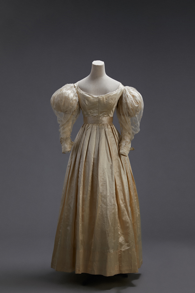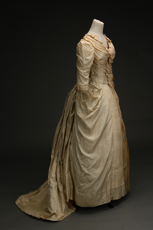A British silk satin wedding dress made in the time of Queen Victoria is supported by a bustle in the back below the waist to expan d the skirt with puffed sleeves an d wrinkles cuffs.
