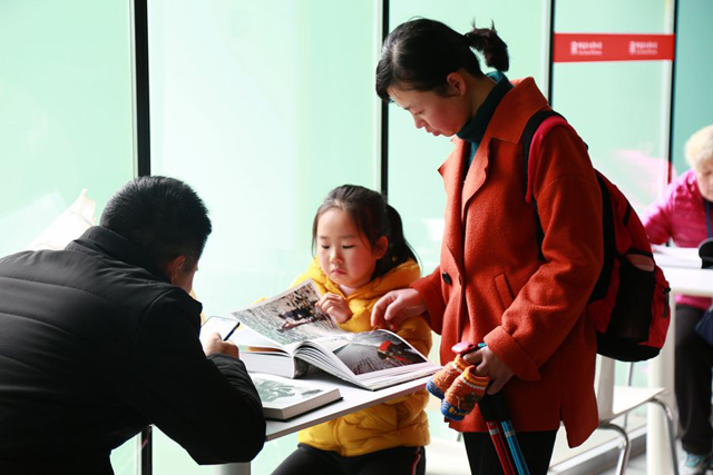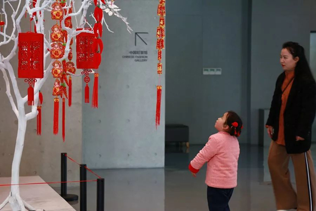 剛開門就迎來了大批觀眾蜂擁而入,有外地來杭的旅游團,有三五成群的好友,也有一大家子共同來觀展的,有滿頭銀發(fā)的老人,安靜地坐在那里“書中覓四十年時尚”,也有步履蹣跚剛學(xué)會走路的孩子好奇地盯著掛滿福字的喜慶樹。大家都是來國絲館過一個不一樣的春節(jié),過一個有意義的文化年。