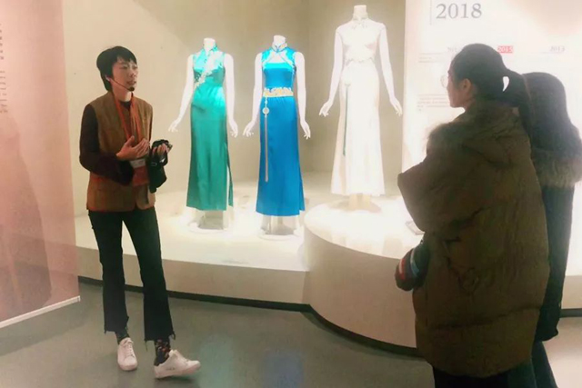 展廳的布置深具匠心。不僅是時間段的分配十分合理,與各個時間段對應(yīng)的展品分配得也很是合適,讓觀眾通過瀏覽展品,越來越確定和深入的理解文化自信。墻上的屏幕,滾動播放著四十年來時裝的變遷。高墻上的文圖,簡要地勾勒出四十年來的時裝演變史。每一次志愿講解,是服務(wù),更是通過服務(wù)得到學(xué)習(xí)。在中國絲綢博物館度過的一天,身心放松,心靈變得更豐富。騎車踏上歸途,又在期待著下一次。