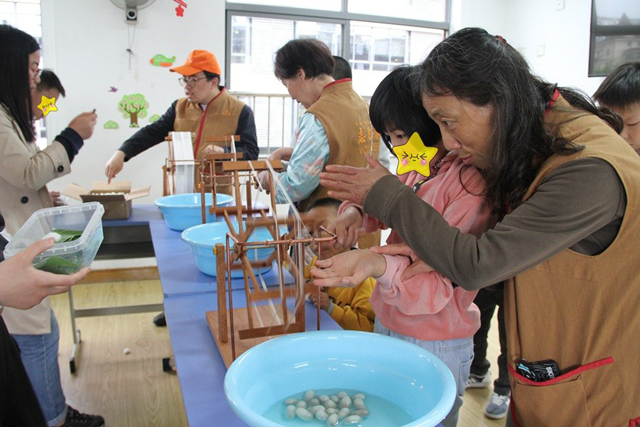 由于改擴建后第一次將女紅傳習活動帶進特殊學校,國絲館準備了多項體驗活動,除了前期提供的科普養(yǎng)蠶,這次還有絲綢紋樣填彩、蠶繭繅絲、紙板織、迷你織機體驗以及6株不同品種的桑樹苗和“絲綢文化進校園”流動展板。在課程環(huán)節(jié)設置上,工作人員更是進行細致策劃以期望貼近孩子們的動手學習能力。