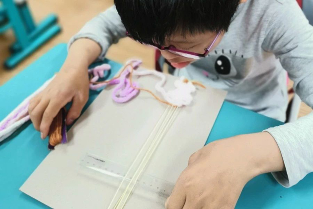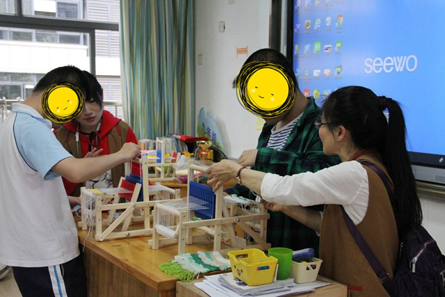 體驗迷你織機讓孩子們了解簡單的織機操作步驟,發(fā)現(xiàn)將線變成布的變化,有的孩子還為之著迷。